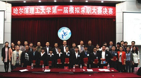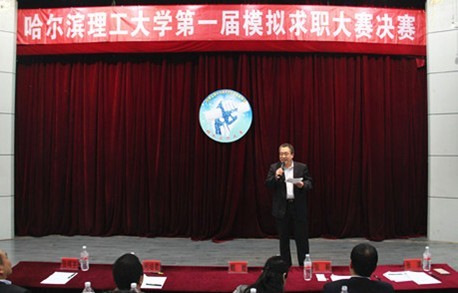 “哈尔滨理工大学第一届模拟求职大赛”决赛于5月10日晚18:00点在西区一号楼0220报告厅成功举办。本次大赛由我校招生与就业工作处、团委、校国家大学科技园主办,测通学院团总支学生会承办。参加决赛的嘉宾有:校长助理孟庄、省大中专学校信息咨询与就业指导中心培训部部长刘鸿宇和市场部部长孙庆彬、校国家大学科技园总经理于澎田、学生处处长满春涛、测通学院党委书记周长群、团委书记单鹂娜、招生与就业工作处副处长高山、测通学院党委副书记刘坤雁、材料学院副处级辅导员李双。招生与就业工作处全体工作人员、测通学院全体辅导员也全程参加了决赛。