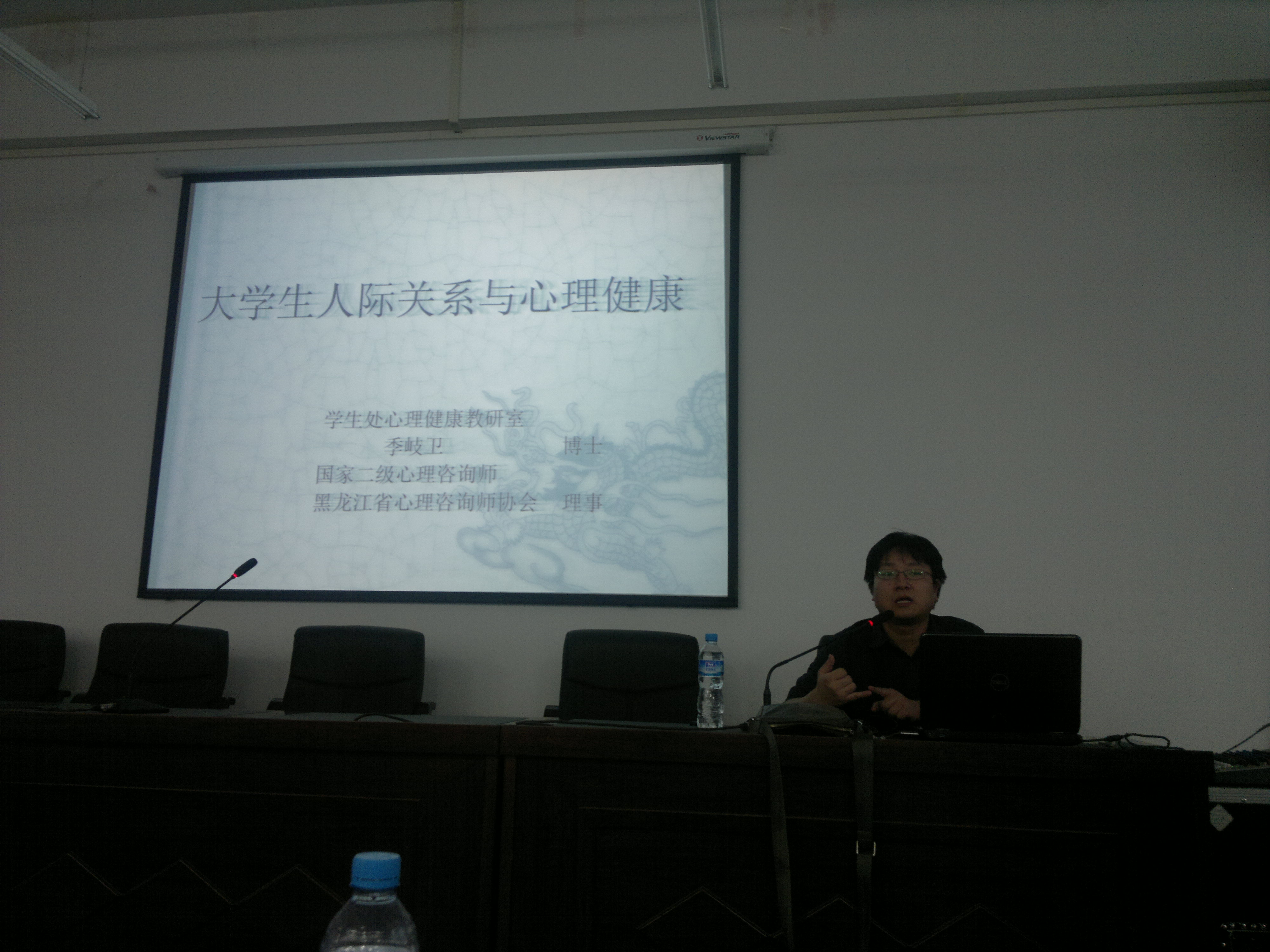 人际交往是大学生身心健康、获得安全感的需要,更是大学生确立自我价值感的需要,关系着大学生的发展与人生幸福,同时,在一定程度上,人际关系与人的心理健康息息相关。为此,2013年5月17日晚六时,测通学院在新教学楼E0904特邀学生处心理健康教研室季岐卫博士为同学们进行以“大学生人际关系与心理健康”为主题的讲座,测通学院指导教师邬长明与测通学院各班级班委成员参加此次活动。