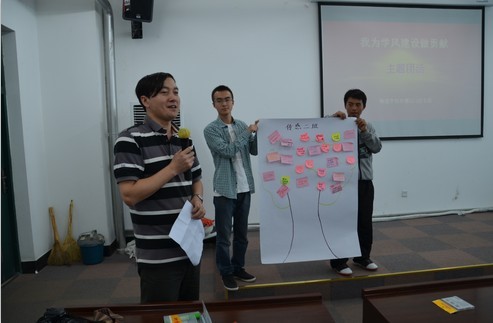 经验交流结束后进入团活第二个环节:团队训练。首先由邬长明老师组织同学们进行多样化分组依次分享了各位同学上大学前最有成就感的事情,从小到大对自身发展影响最大的事情,以及大学目标规划之SWOT分析,从学生的学习动力、价值观、性格等多个维度探索自我,真正解决学风建设中存在的目标不明确,学习动力不足,执行力不强的问题。同学们在一起玩“爱的抱抱”,游戏意在让同学们在未来人生中学会抉择,同学们都理解了游戏真谛。团支部全体同学合作为一棵“理想树”添枝加叶,并作为同学们大学四年奋斗的承诺张贴在辅导员办公室的墙上,鞭策同学们努力学习,再创佳绩。