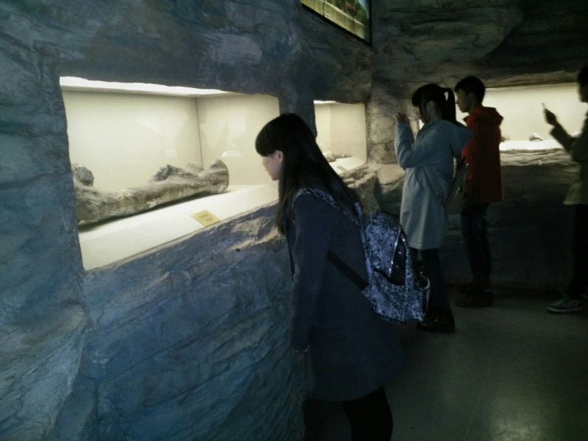 同学们先参观了古生物博物馆。看到了大名鼎鼎的“中华神龙”以及霸王龙头盖骨还有寒武纪大爆发时的三叶虫骸骨。在这些史前远古生物面前,同学们顿觉自己的渺小。接下来游览了东北冰河世纪时期的猛犸象遗骨,以及史前剑齿虎,史前东北野牛。同学们在这里拓展了见识,意识到东北曾经是一个生机勃勃,品种繁多的多样化生态环境。