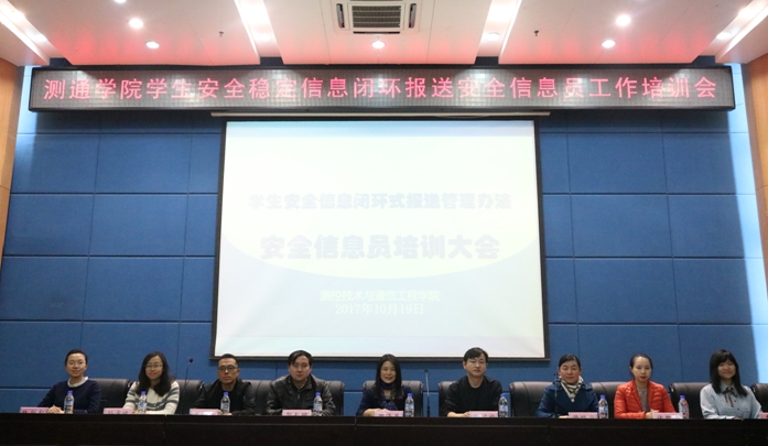 在全国喜迎十九大召开之际,为确保学生及校园和谐安全稳定,提高学生自我教育、自我管理、自我服务的能力。测通学院于10月19日中午12点20分在新主楼五楼报告厅召开了学生安全信息员培训大会暨学生安全稳定信息闭环报送工作启动仪式。学院党委副书记田海燕、全体辅导员以及全体安全信息员参加了本次大会,会议由辅导员徐晓微老师主诗。