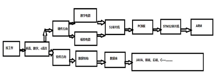 如果说你们想找工作,我建议还是来到实验室,首先实验室安静,其次有资源(学长、老师、设备),当你迷茫的时候去问问学长,学习的方向,那些行业最吃香,那些行业最有潜力,你适合什么行业。如果说你就想做一个技术控,那么我建议首先学好数学、英语、C语言。数学是你的逻辑思维能力;英语就更重要了,在技术应用中,基本绝大多数的资料(用户手册,API)都是外国人开发的,你必须读的懂他们的用户手册,绝大多赚钱的机会,都是掌握了技术的最前沿,如果你等到其他人翻译过来,那都已经时过境迁了;C语言是以后所有语言的开发基础,那必须得掌握。如果说你想学习硬件方向,我建议先学好数字电路与模拟电路,这是硬件电路的基础,然后在以上基础的条件下,在去深入的学习STC89C51单片机,试着用这些技能做一个遥控小车,或者循迹小车玩玩,是很有意思的;然后就可考虑学习绘制PCB板,让整个电路集成起来;在此基础上考虑学一下STM32F103系列单片机,这个是相对于STC89C51单片机整体实现一个升级,也可以考虑做一些小的项目玩玩,比如平衡车、四旋翼飞机、电子秤等等(在找工作中,面试官很重视这些项目的);后来可以考学习Linux操作系统,ARM开发系统。