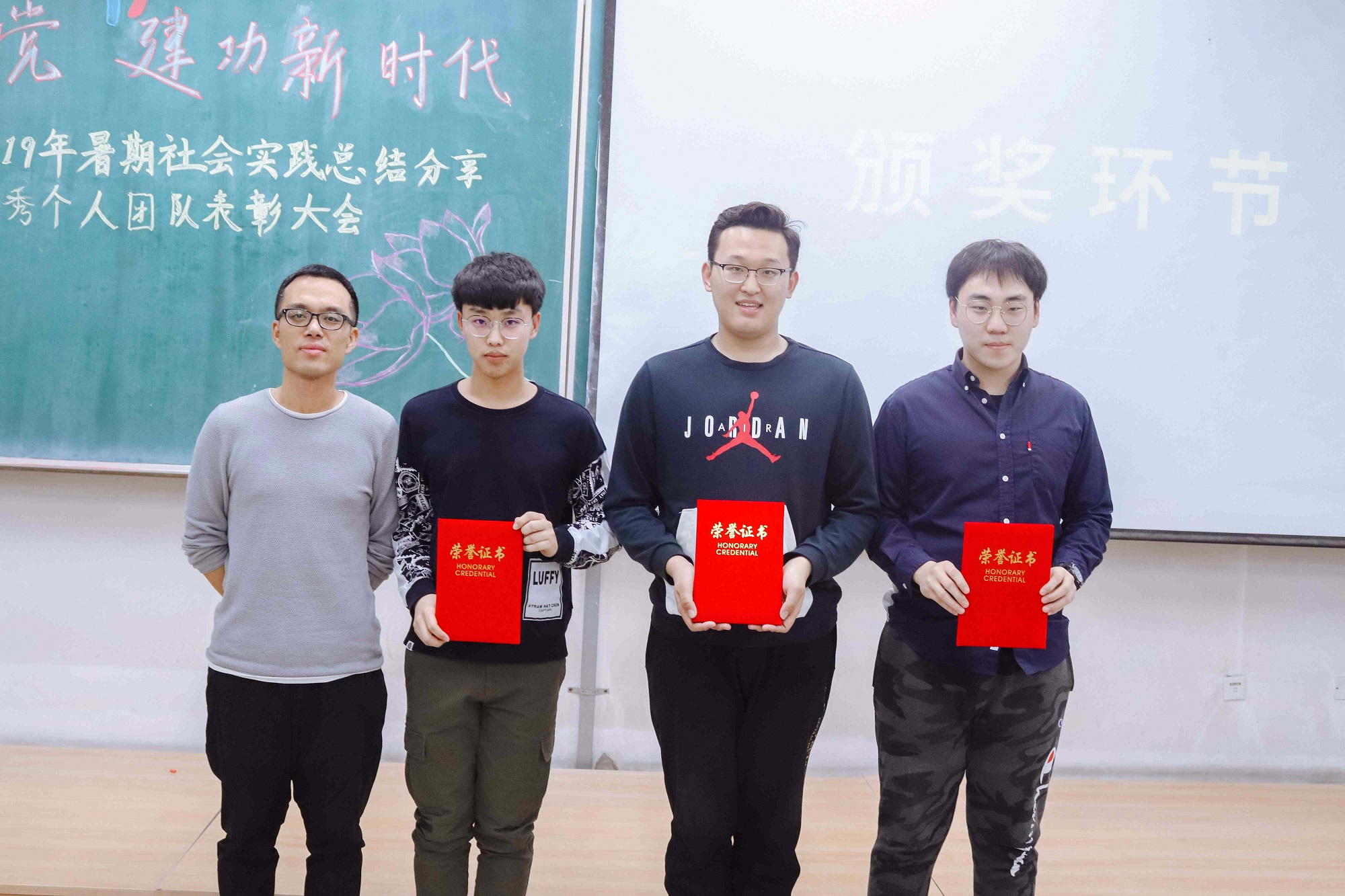 在表彰环节,由测通学院党委副书记田海燕为获得“中国大学生自强之星”、黑龙江省“十大杰出青年志愿者”标兵的毕轩学长和2018-2019年度研究生支教团优秀志愿者的吴静谊学姐颁奖;团委书记姚春波老师为测通学院暑期社会实践优秀团队颁奖;学生会指导教师张德龙老师为测通学院暑期社会实践优秀个人颁奖。通过颁奖环节鼓励先进典型,发挥优秀典型的模范带头作用,同时学长学姐的经验分享激励着在座2019级学弟学妹,希望他们在未来的暑期社会实践中再创佳绩。