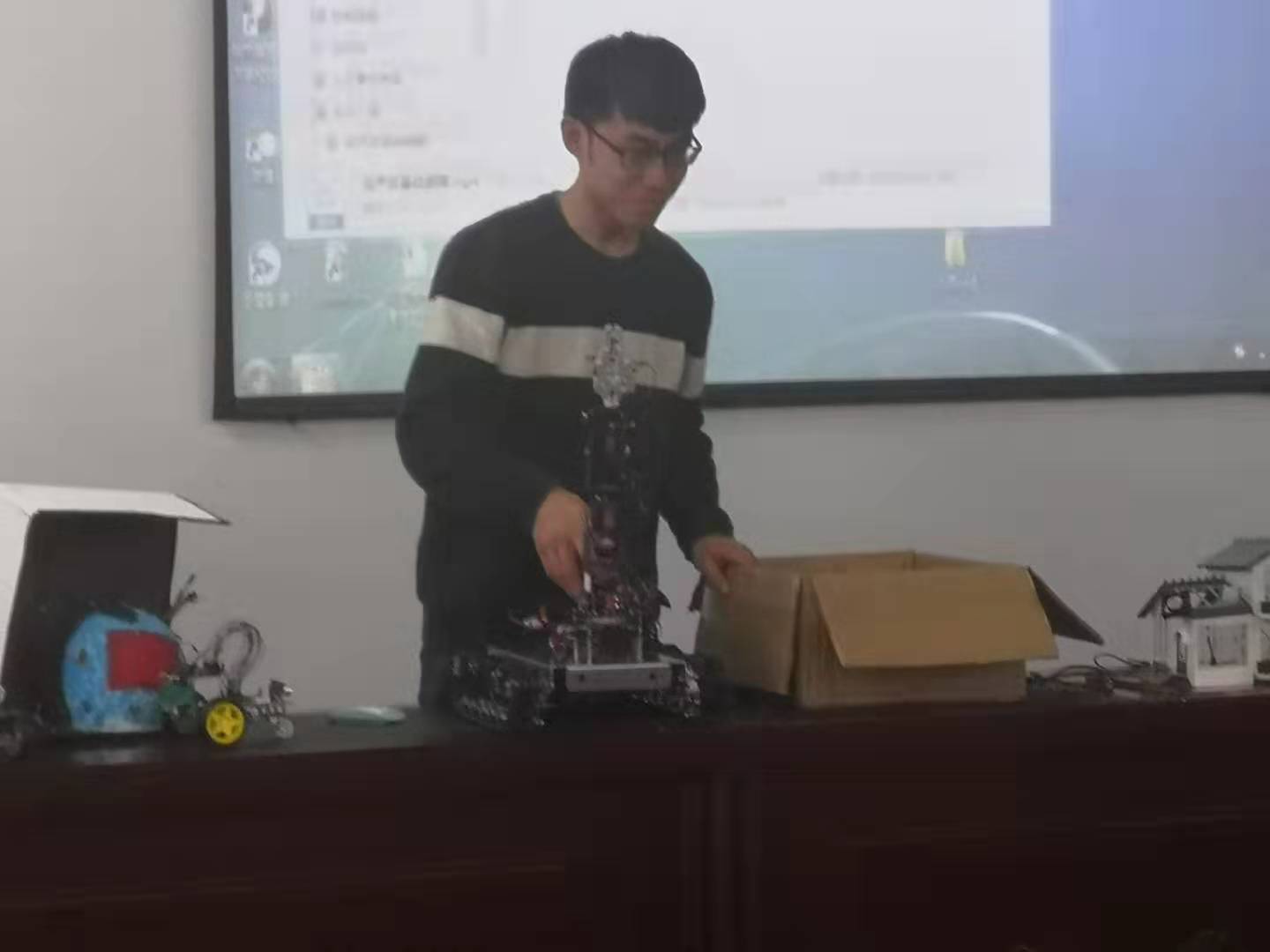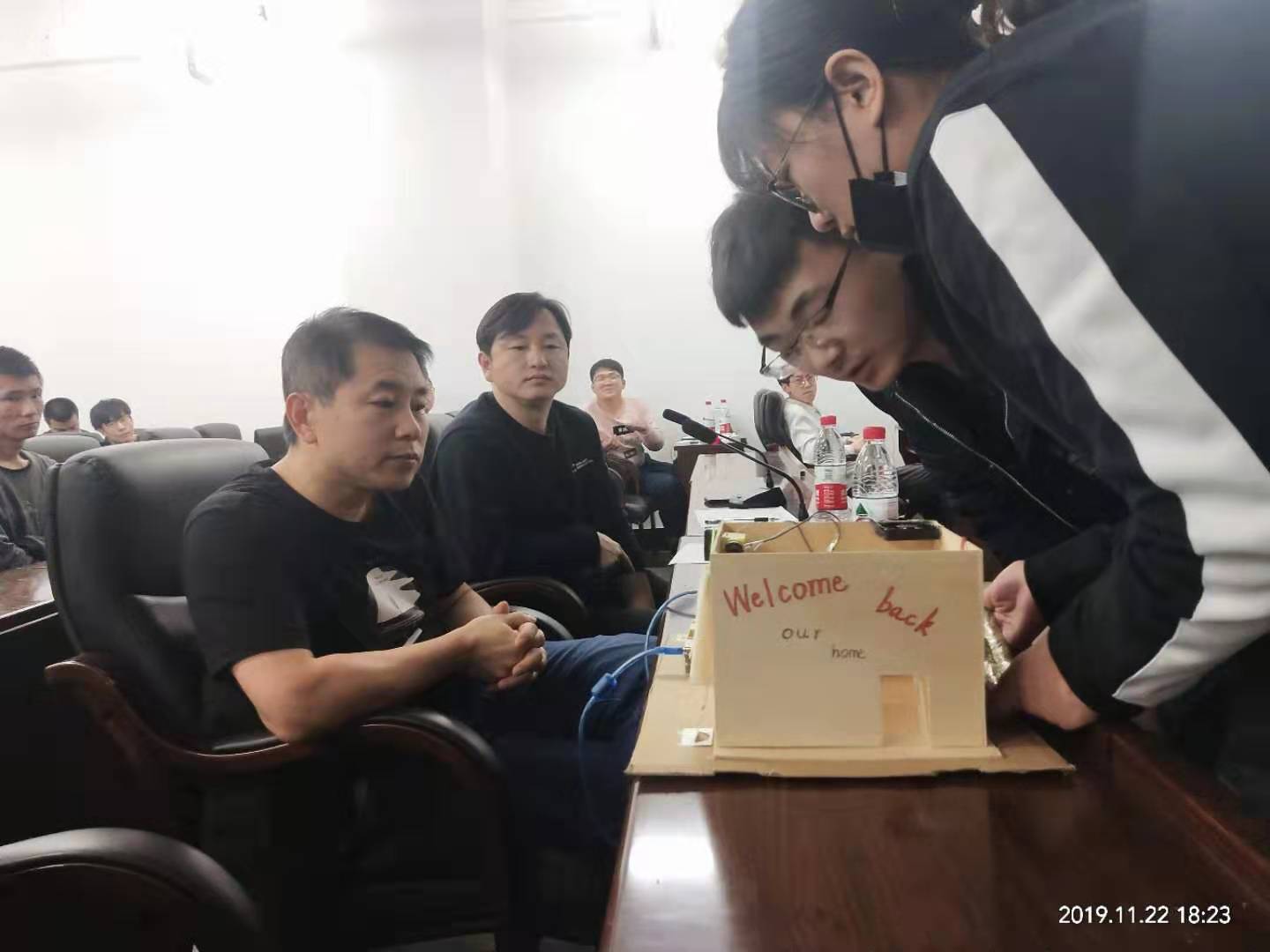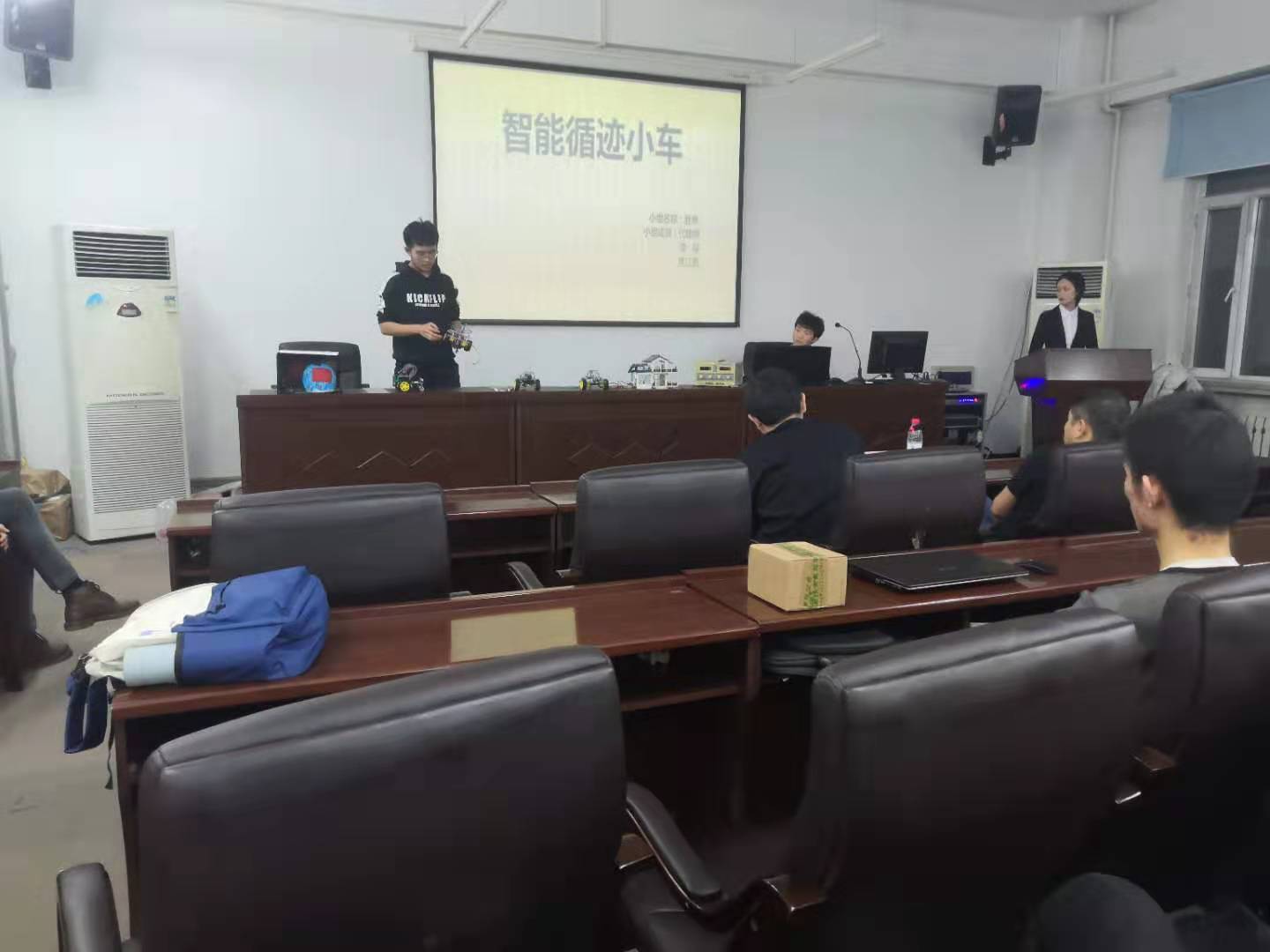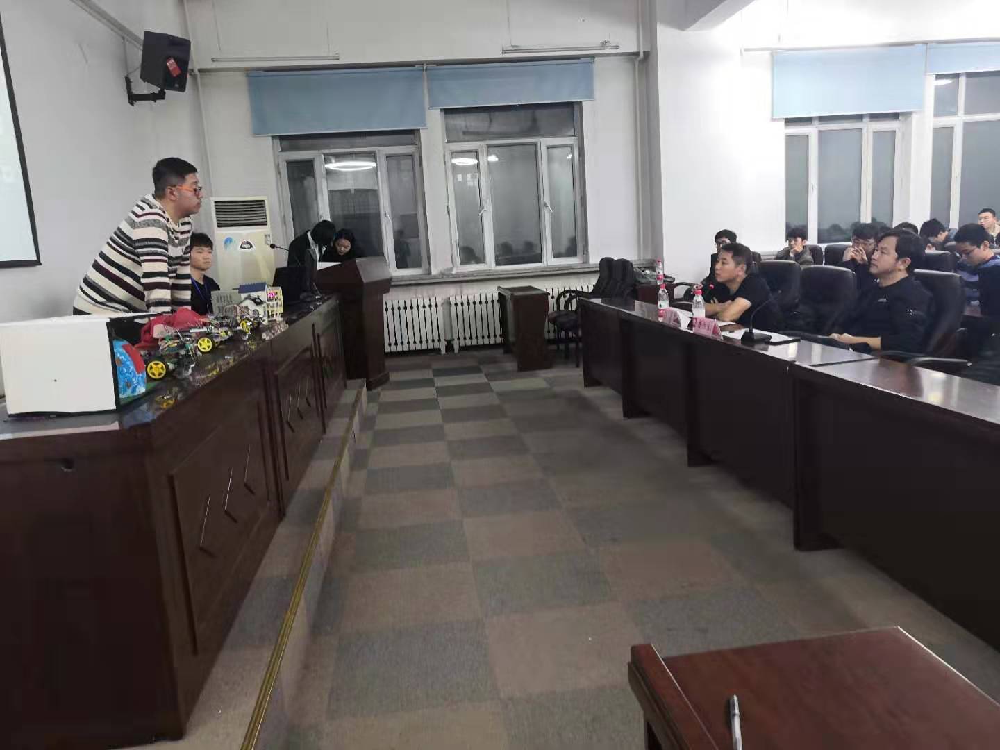 首先,杨老师代表学院对本次比赛的顺利开展致以热烈的祝贺,并对工作人员和参赛选手表示感谢。他指出,本次大赛是我院科技活动继彩灯创意设计大赛之后,又一次全新的尝试,希望同学们在比赛中,将专业知识和创新思维有机契合,创造出优秀的作品。随后所有参赛选手将作品逐一展示,包括设计思路、设计过程以及所遇到的问题,每组限时三分钟讲解与介绍。讲解过后,选手将作品放在指定位置,供评委老师仔细评判,并认真聆听评委老师的的评价与建议,回答老师所提出的问题。其中,来自测通学院的“王者归来队”设计的利用红外传感器、温度传感器、语音识别技术的智能家居系统成为本届科技节的一大亮点,而来自电气学院的“无名氏队”带来的机械臂、测通学院“1024队”设计的智能小车凭借极具科技感的外形与灵活流畅的操控得到了在场观众们的一致好评。