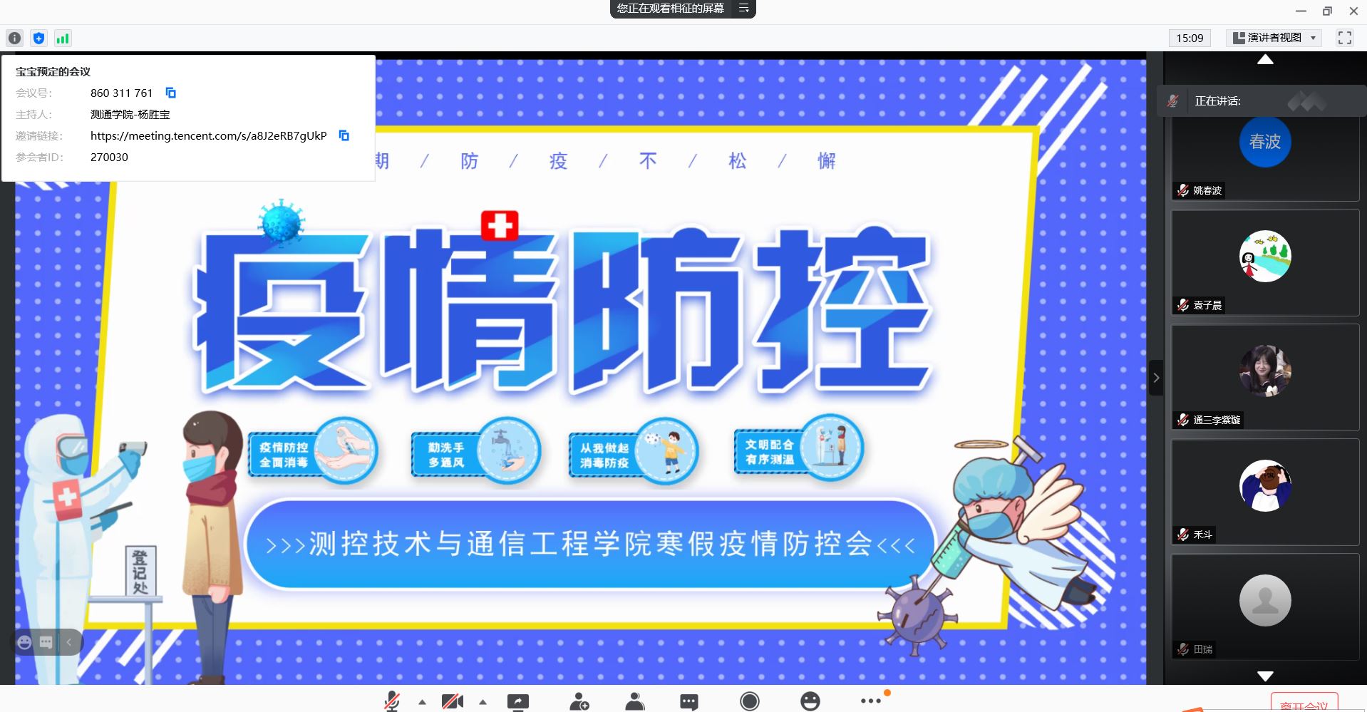 通过此次疫情防控线上会议的召开,测通学院学工队伍和全体学生干部明确了近期工作重点和工作要求。会议效果理想,传递了情感,树立了信心,为做好下一步学院疫情防控工作奠定了有力基础,提供了坚实保障。期待在测通学院全体师生共同努力下,我们会成功渡过这次疫情考验,健康平安,继续携手向前!