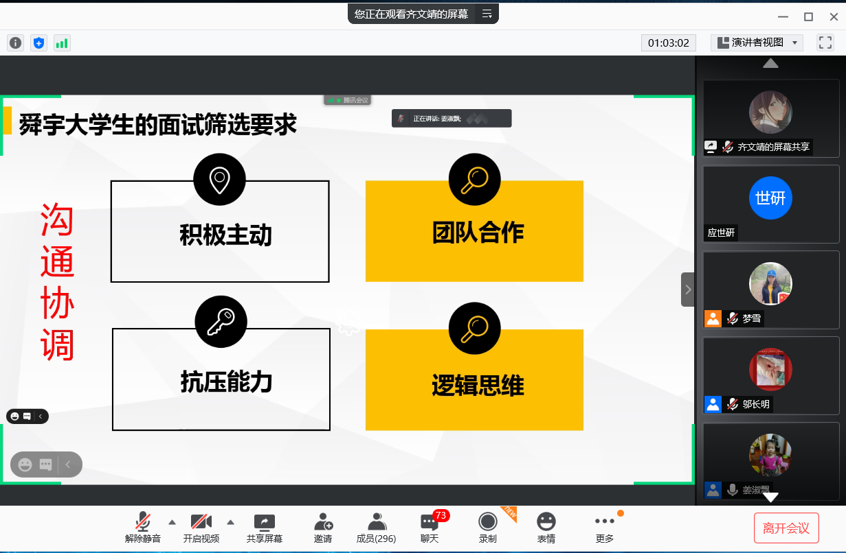为进一步提升学院就业工作质量,提早规划本科学生职业生涯,丰富学生假期生活。2021年2月2日、3日下午14时学院邀请舜宇集团招聘经理姜淑飘女士针对2018级和2020级学生特点以《大学生就业指导-企业版》和《如何通过大学四年打造一份漂亮的简历》为题别开展两场线上职业生涯规划讲座。学生处副处长任佳伟、学院副处级辅导员相征、学生处职业规划和就业指导课程负责人王珊、学院就业干事邬长明、2020级辅导员侯梦雪、2018级辅导员张德龙及500余名学生在腾讯会议室参加讲座。