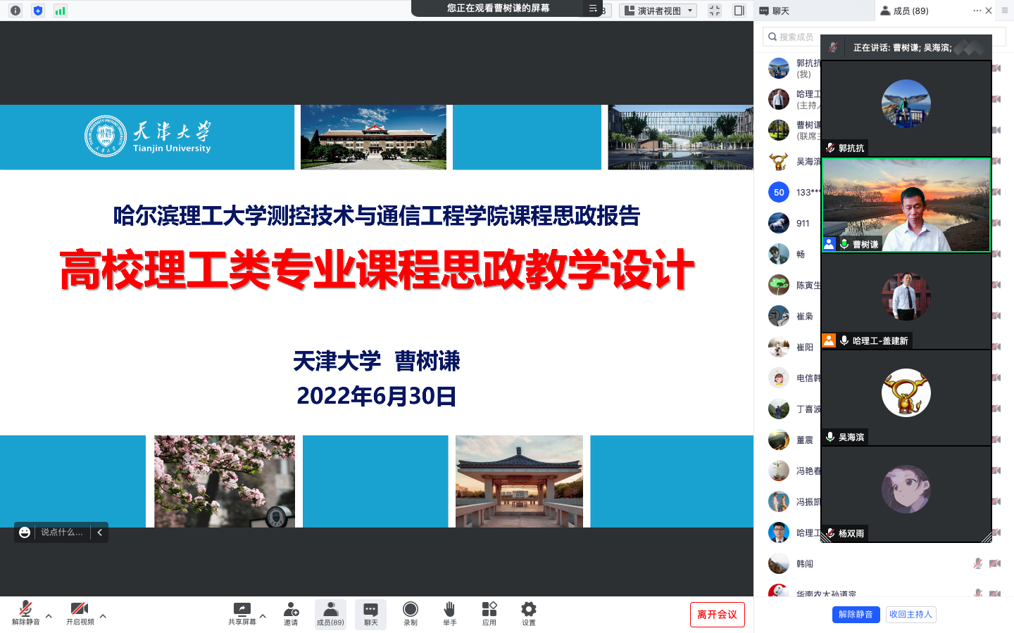 为全面落实立德树人根本任务,推进我院课程思政建设,促进教师课程思政理论认知与实践能力提升,提高课程育人实效,2022年6月30日下午测控技术与通信工程学院特邀天津大学省级教学名师曹树谦教授开展了课程思政专题报告会,报告会采用线上方式进行,由学院教学副院长盖建新主持。报告历时两个小时,吸引了来自测通、机械、电气、计算机等学院130余名教师聆听。