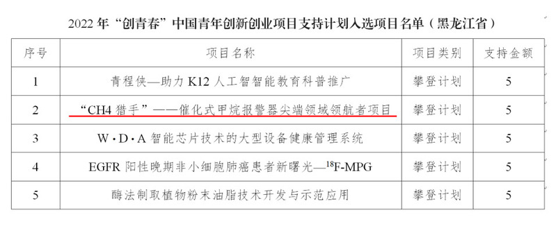 近日,由共青团中央主办的2022年“创青春”中国青年创新创业项目支持计划公布入选项目名单,我院教师孙慧、邬长明指导的项目《“CH4猎手”——催化式甲烷报警器尖端领域领航者》成功入选科技创新“攀登计划”类项目,获5万元资助,黑龙江省仅5项入选。
