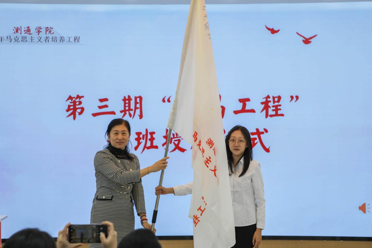 随后举行的授旗仪式上,杨芳为第三期“青马工程”培训班授旗。在庄重的授旗仪式后,第三期新学员代表关欣童作了表态发言。她表示,全体新学员将倍加珍惜此次学习机会,以饱满的热情投入培训,端正学习态度,坚持知行合一,严守培训纪律,努力在理论学习中筑牢信仰根基,在社会实践中锤炼过硬本领,立志成长为坚定的青年马克思主义者。