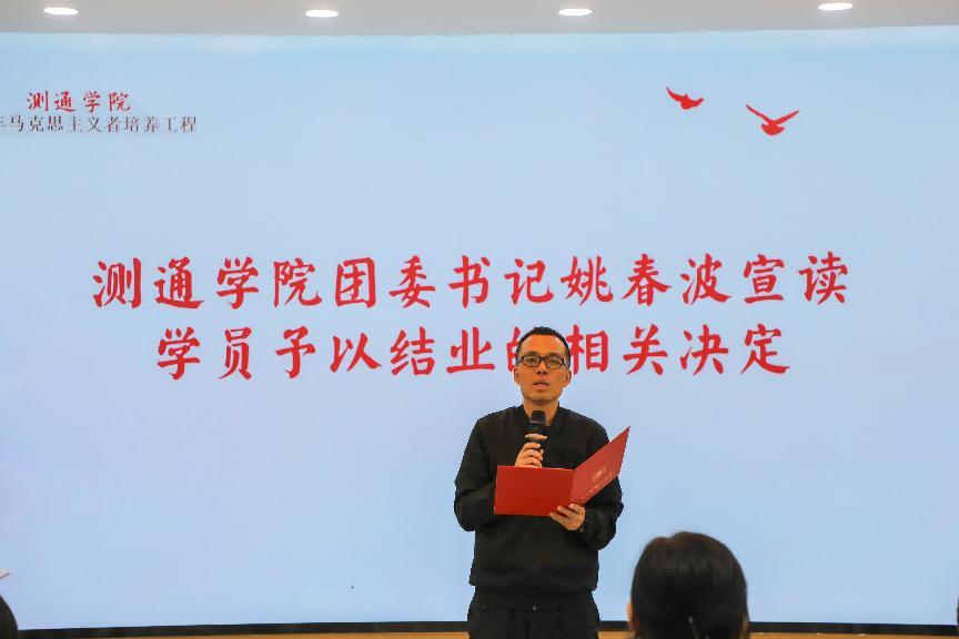 学院团委书记姚春波宣读了《关于测控技术与通信工程学院第二期“青马工程”培训班学员准予结业的决定》和优秀学员名单,并对第二期学员的顺利结业表示祝贺。
